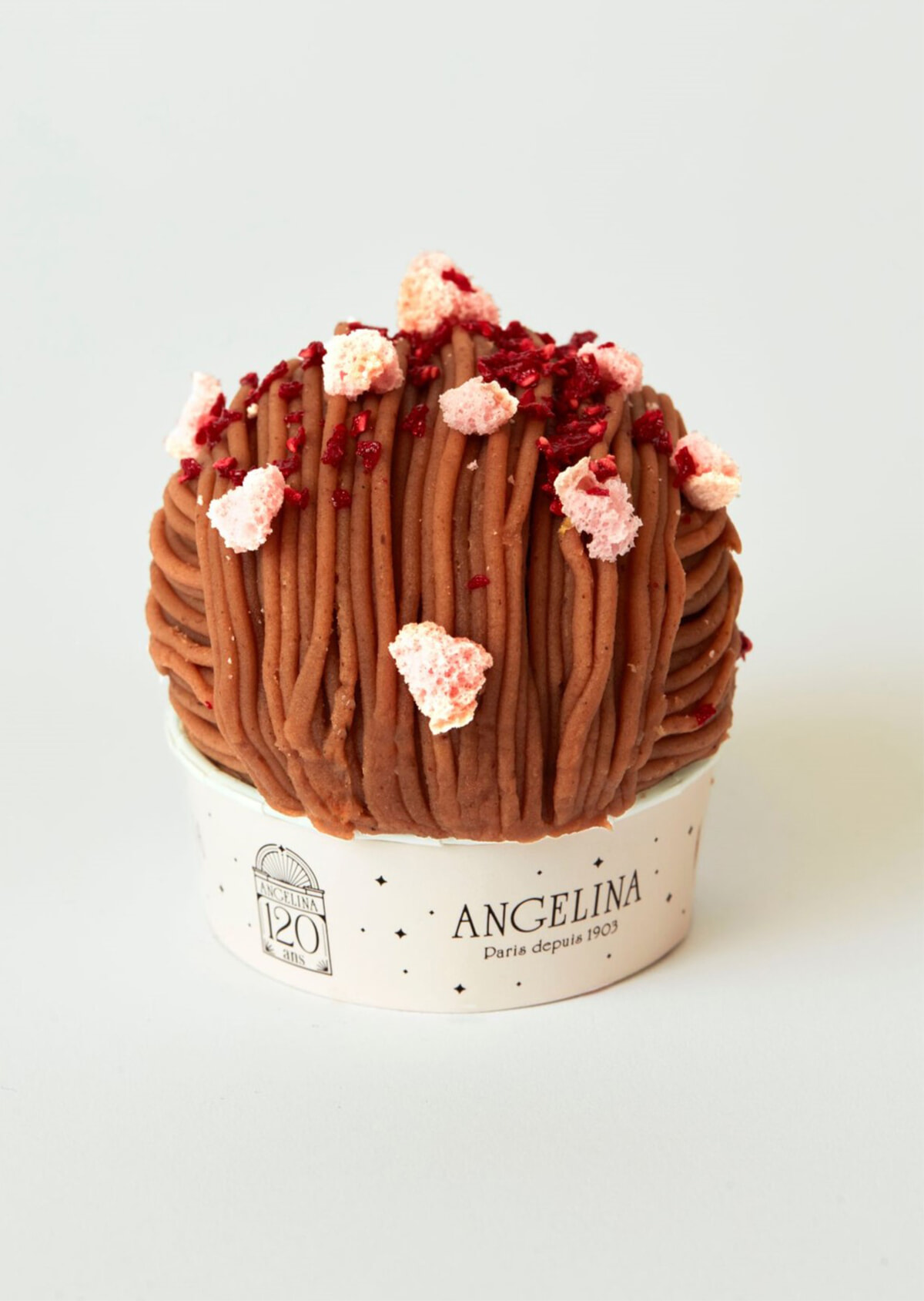 毎日がお祭りのようなアンジェリーナだけれど、今年は創立120周年。これを記念しておなじみのパティスリー、モンブランのスペシャルバージョンが誕生した。メゾンのアイコニックな存在であるモンブランがいつ生まれたのか正確な記録はないけれど、1903年からそう遠くない時期にランペルマイヤー自身がクリエイトしたようだ。10月18日から販売が始まった記念モンブランの名前は「Mont-Bisou(モン・ビズー)」。子どもの頃からアンジェリーナに通い、モンブランがお気に入りというパリジェンヌのジャーナリスト、Peggy Frey(ペギー・フレイ)とのコラボレーションによる味だ。マロンクリームにフランボワーズ&ローズのムースを組み合わせ、甘酸っぱさがカリッとしたメレンゲと混じり合って……これぞ、お口の喜び!