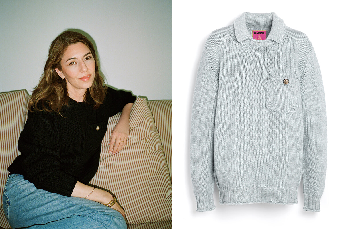 カプセルコレクションの厚手のセーターを着たソフィアコッポラ。この型は黒とグレーがある。ポロ襟とポケットのフォルムがチャーミングだ。1950ユーロ。photo:(左)Sofia Coppola by Margaret Qualley for Barrie