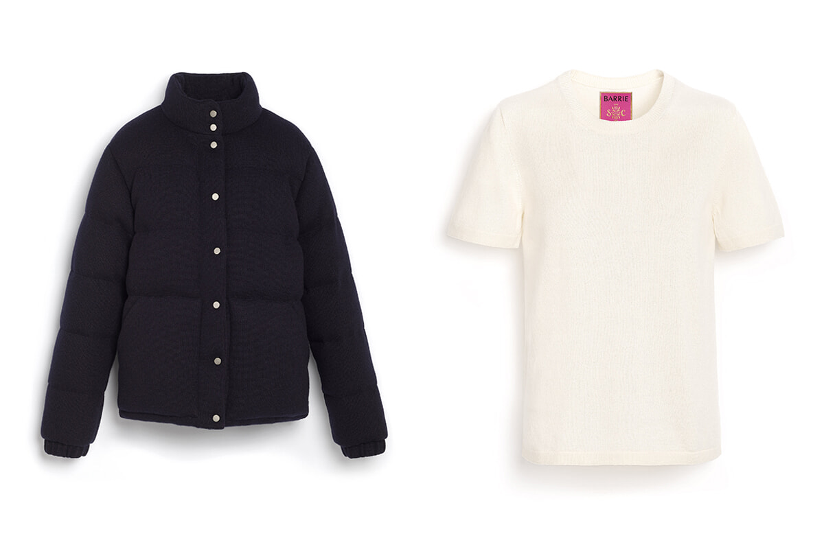 左:カシミア、ウール、シルクのダウン。グレーもあり。6500ユーロ 右:カシミア・シルクのTトップ。黒、白、グレーの3色あり。520ユーロ