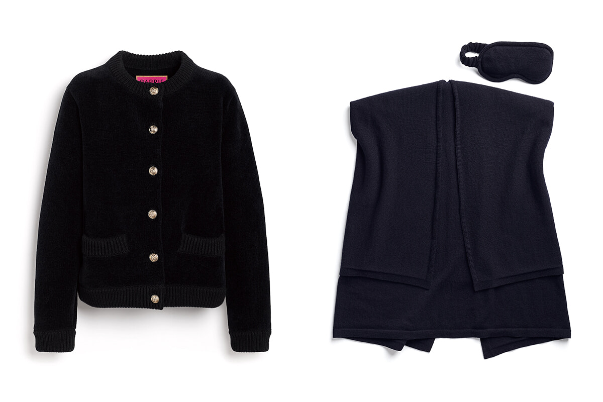 左:カシミアとコットンのベルベット調カーディガン。2250ユーロ 右:ケープとアイマスクをセットしたトラベルセット。1250ユーロ