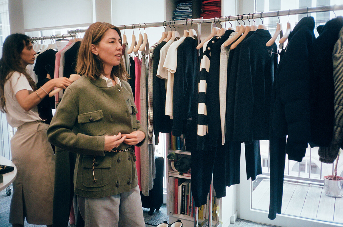 カーキ色のミリタリージャケット(2500ユーロ)をショールームで試着するソフィア・コッポラ。