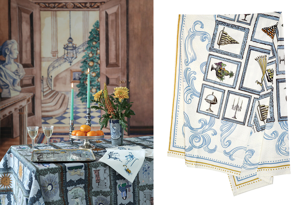 モチーフを眺めているとシャトーのノエル気分を味わえるテーブルクロス。160×160cm(80ユーロ)、160×280cm(100ユーロ)。