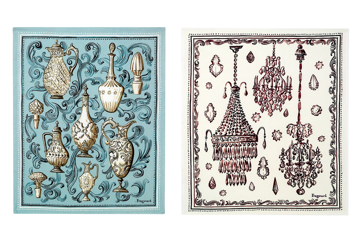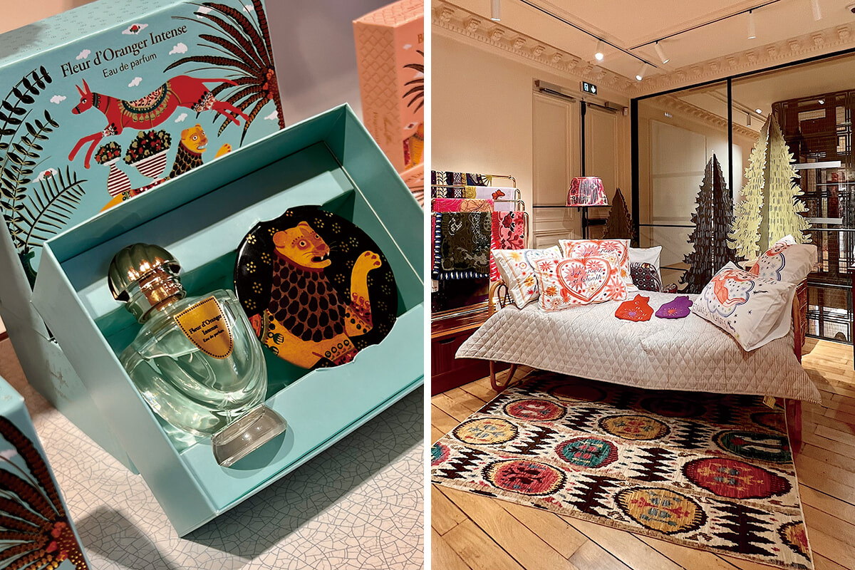 左:フラゴナールならではの香りのギフトセット。オードパルファン「Fleur d’Orange intense」(50ml)とポケットミラーがセットで46ユーロ。 右:クッション、パジャマ、大判ストールなど。寛ぎの時間のアール・ドゥ・ヴィーヴルも大切に。プレス発表より。photos:Mariko Omura
