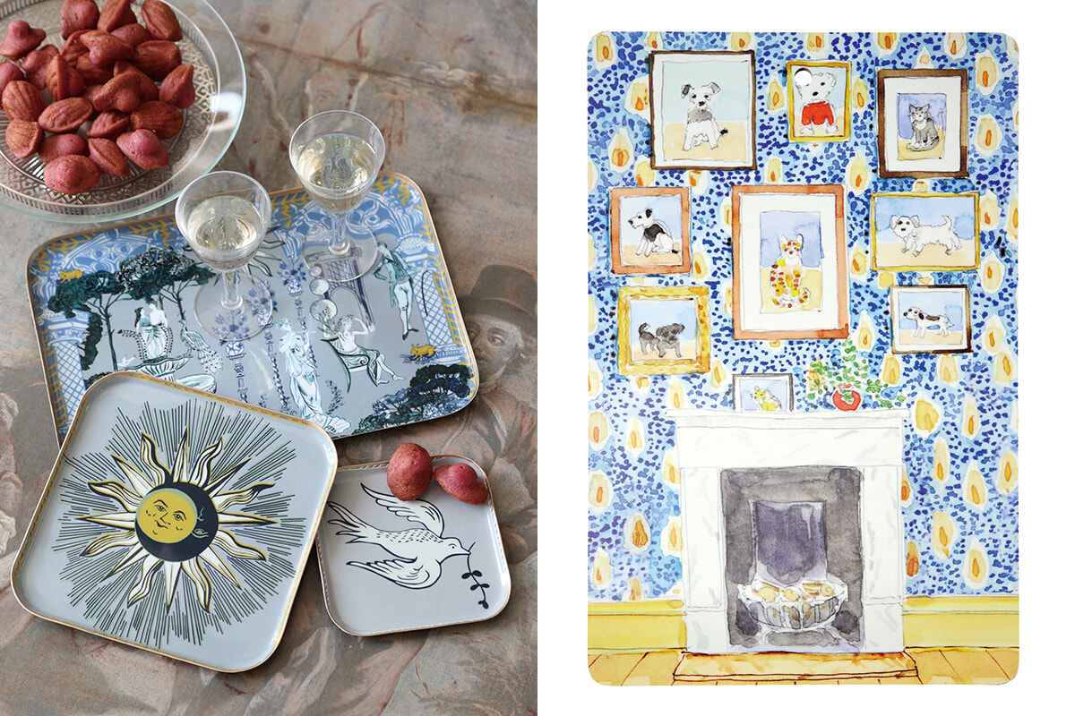左:食卓だけでなく家のあちこちで重宝するプレートはモチーフ、フォルム、サイズが複数。 右:犬のポートレートのギャラリーが描かれたカットボード。12ユーロ