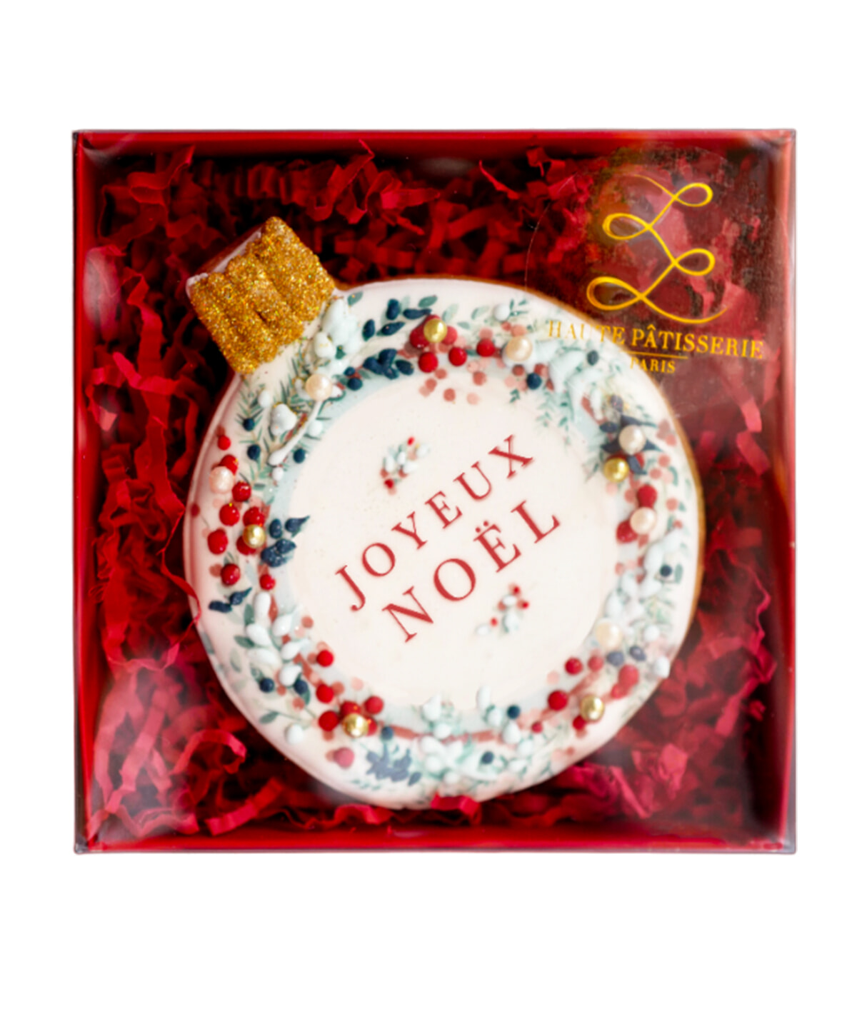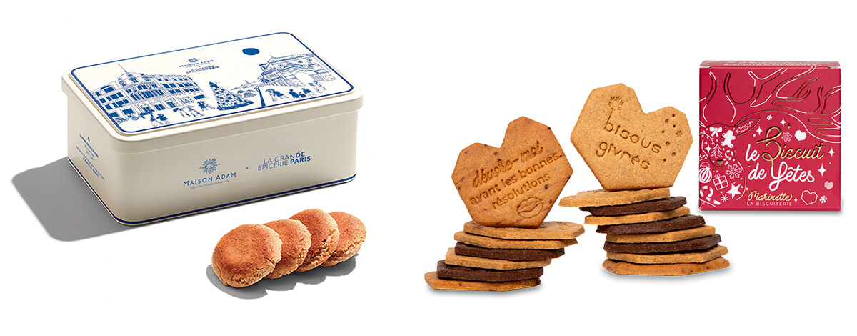 左: ビアリッツの老舗Maison Adamとラ・グランド・エピスリーのコラボレーションによるマカロン24個ボックス。限定販売で39ユーロ。Maison Adamのポップアップは12月15日〜31日の開催。 右: Marinetteのパーティ・ビスケット。メッセージ入りビスケット12個セットで13.50ユーロ。