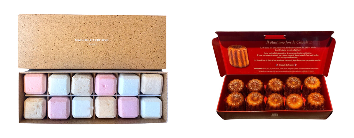 左: Maison Carrouselのクリスマス・マシュマロ。8ユーロ(4個セット)〜。ポップアップは12月9日〜24日の開催。 右: Baillardranのカヌレ。25ユーロ(10個セット)〜。ポップアップは11月29日から12月13日の開催。