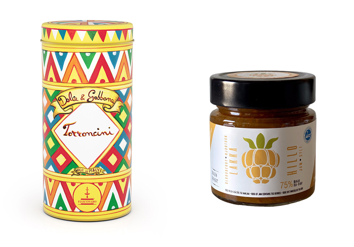左: シチリアのFiasconaroとドルチェ&ガッバーナのコラボレーション。中身はハニーとアーモンドのヌガー。29.90ユーロ 右: フィンランドから北極ブラックベリーのジャム。10.90ユーロ(250g)