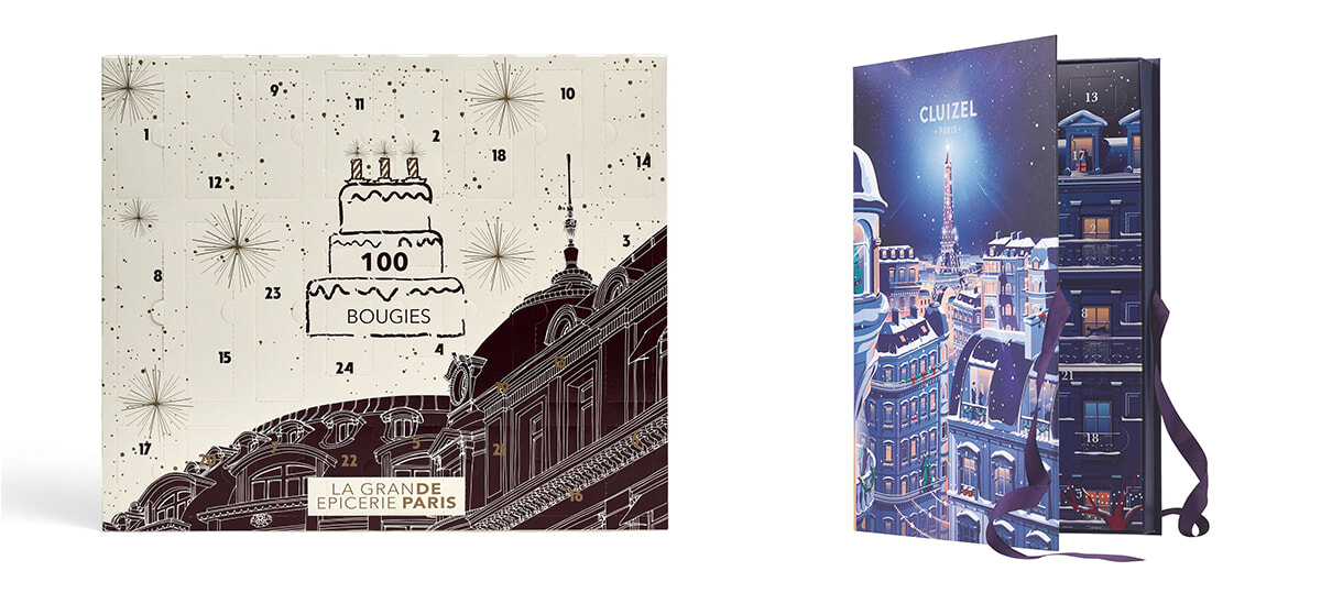 左: ラ・グランド・エピスリーのオリジナル・アドベントカレンダー。フランス産のキャンディやチョコレートがセットされている。19.90ユーロ 右: ショコラティエMichel Cluizelのアドベントカレンダー。49.90ユーロ