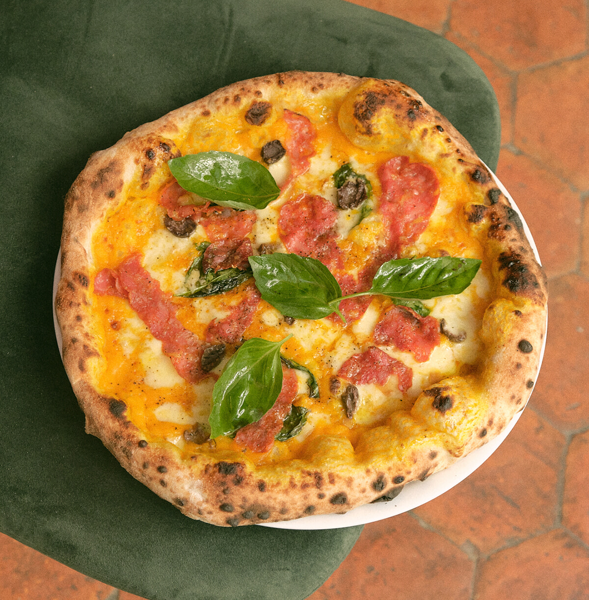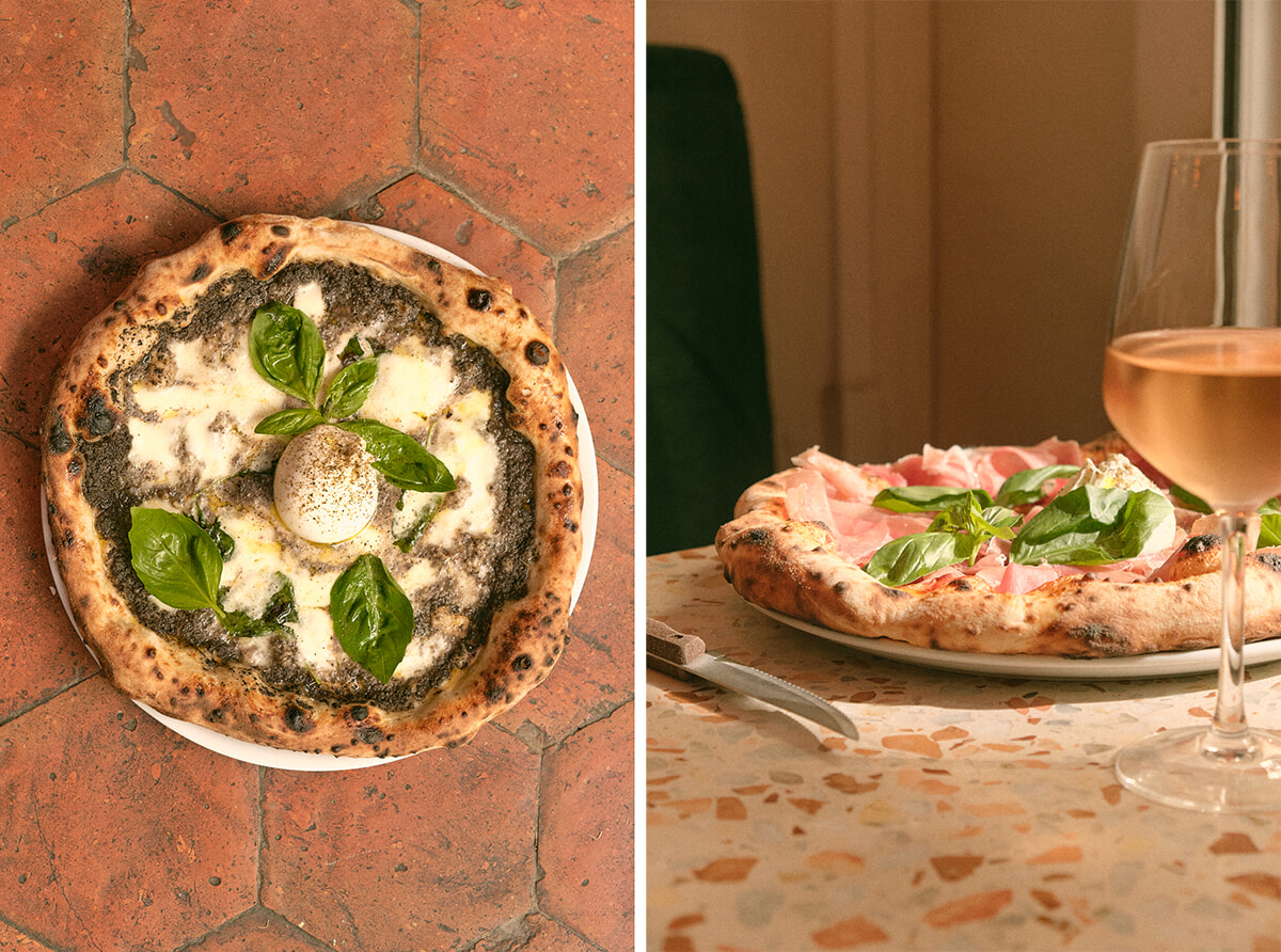 ベースとなるピッツァ生地に使うのは、熱を加えないコールドプレスで挽く小麦粉なので、味わいも滋養も失われておらず。36~48時間発酵させた生地に敷くトマトソースは、マッテオが試行を重ねて選び抜いたヴェスヴィオ山の傾斜面で育つ複数のトマトをミックスしたもの。季節の素材を用いているのでメニューの7種のピッツァは3カ月で内容が変わる。たとえば、トマトの代わりにカボチャのクリームソースをベースにしたピッツァはいまの季節ならではの味わいだ。ブラータ、スピアナータ(ソーセージの一種)、パルマハムなどイタリアから週に2回届く厳選した具材を使用。冷凍庫もないシンプルなキッチンをピザ窯が占めていて、そこで焼かれるのはピッツァだけでなくニョッキのグラタンも。