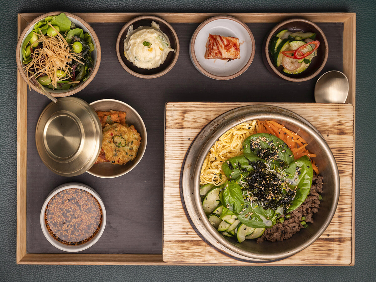 ディナータイムのメインに添えられる5種の小皿料理はどれも味わい深い。写真はディナーのビビンパ(パンチャンとセットで18ユーロ)。photo:The Travel Buds
