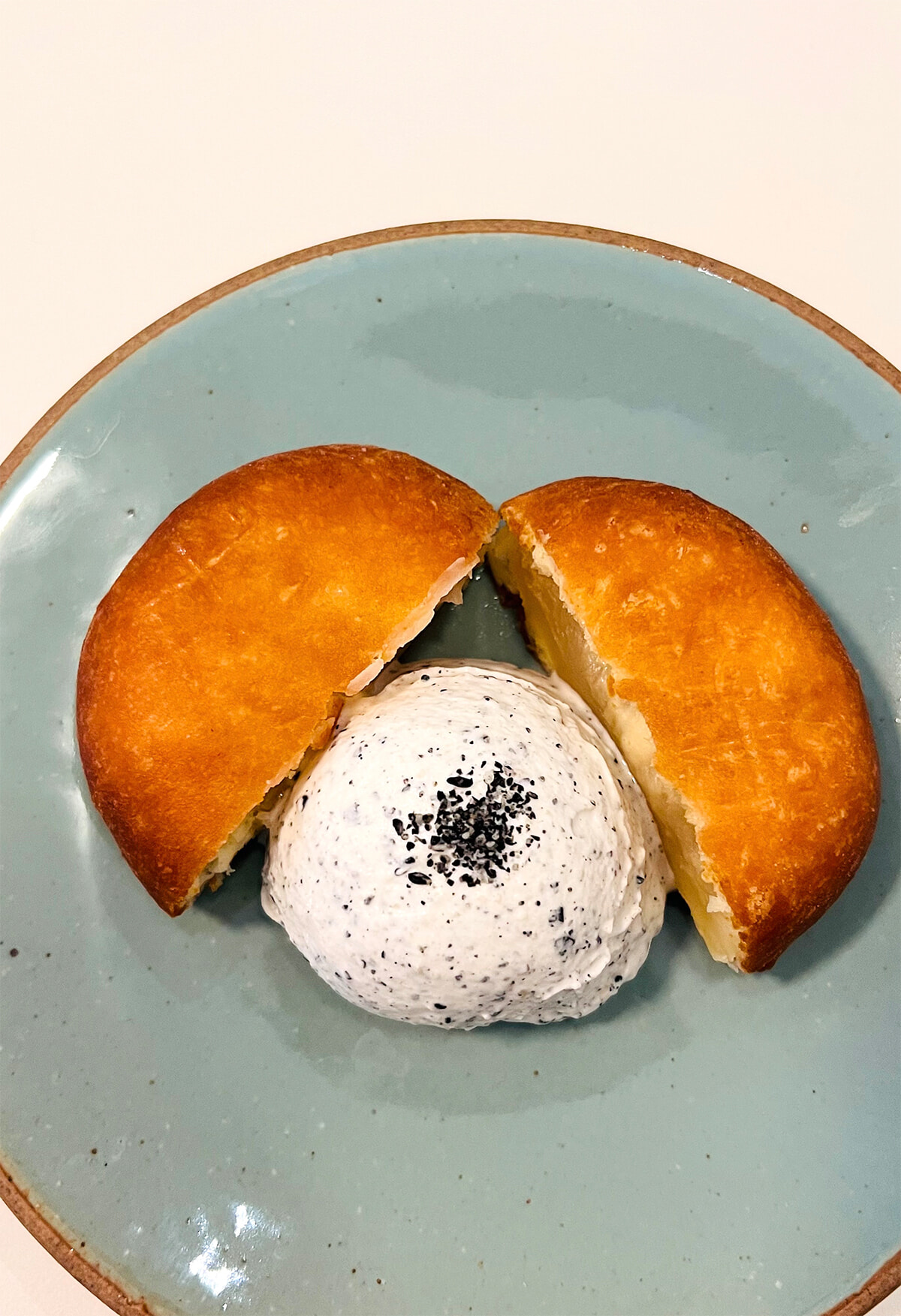 料理同様、デザートも伝統的かつ現代的に。写真はゴマのホイップクリームを添えた白あん入りの揚げまんじゅう(8ユーロ)。photo:Mariko Omura