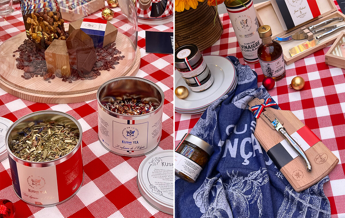 左: 新15ブランドより。手前は南仏のAix&Terraのタプナードとドライトマトのアペリティフセット(17.90ユーロ)。後方はブルターニュのLa Trinitaineのガレット(9.40ユーロ)。 右: 手前は、Degrenneのデミタスセット(2客、スプーン2本 112.90ユーロ)。後方のLa RochèreのワイングラスにはRF (フランス共和国)と浮き彫りされている。4脚セットで34.50ユーロ。