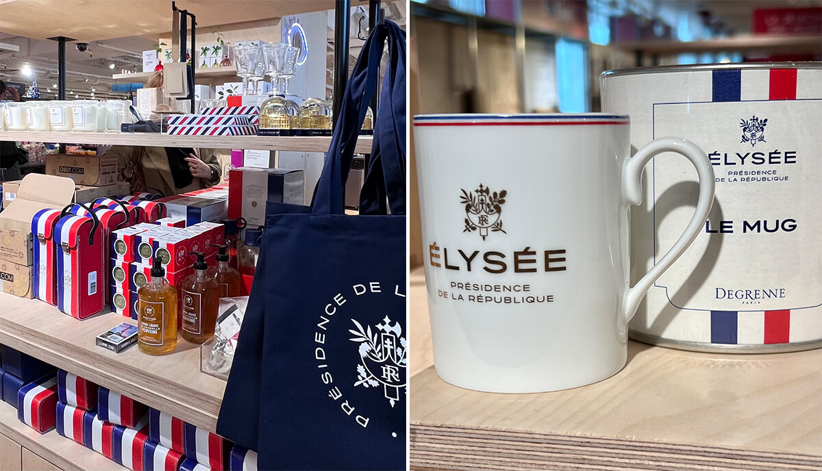 デパートのギャラリーラファイエットの6エムエタージュはL’Espace Parisienne。スイーツも含めてパリ土産に最適な品々が集められたフロアである。ここにコーナーを持つブランドのひとつが、「Elysée – Présidence de la République(エリゼ- プレジダンス・ドゥ・ラ・レピュブリック)」。これはフランス産の品のエクセレンスをプロモーションしようというフランス大統領の意図のもと2018年に生まれたブランドで、その名は大統領官邸を指すエリゼ宮から。アイテムはモードから台所用品、子どものおもちゃなどさまざまで、たとえばセントジェームスのニットなら肩の金ボタンにエリゼのロゴが入っていたりする。