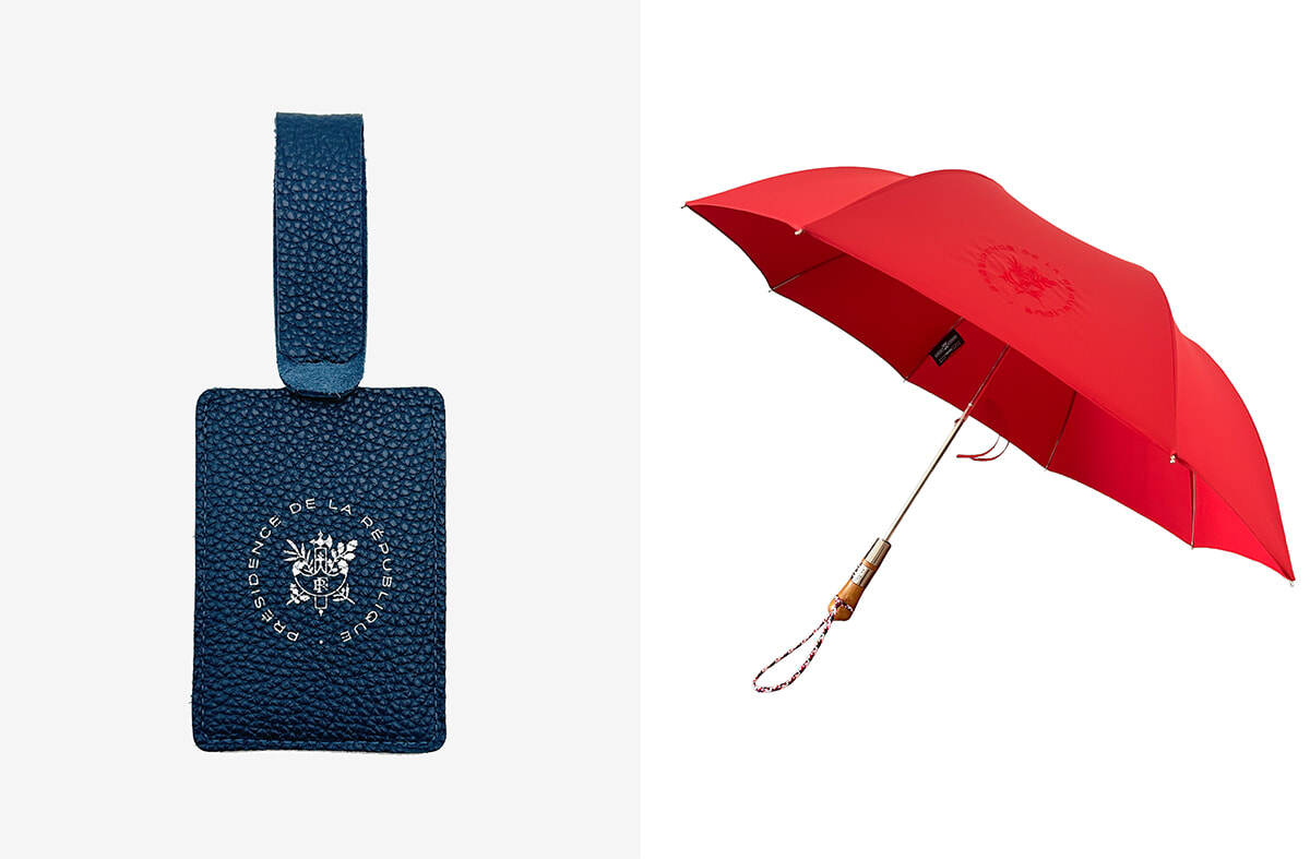 新ブランドより。左: Constant & Zoéのネームタグ(34ユーロ)。 右: La Parapluie de Cherbourgのエリゼのロゴ入り雨傘(169ユーロ)。白、紺、赤の3色あり。