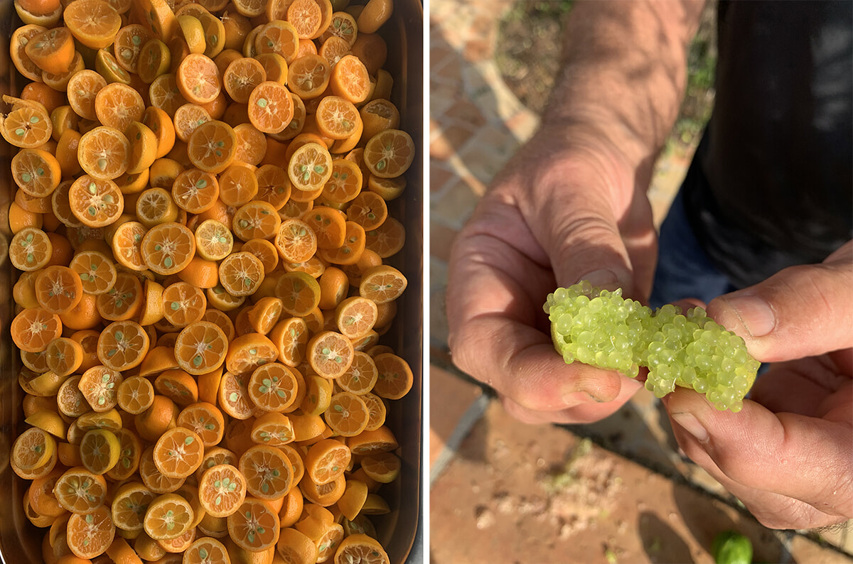 左: キンカンより少し大きめのカラマンシー。レモン・ストーリーが扱うほかの柑橘類同様、果肉だけでなく皮まで味わう。 右: レモンキャビア。