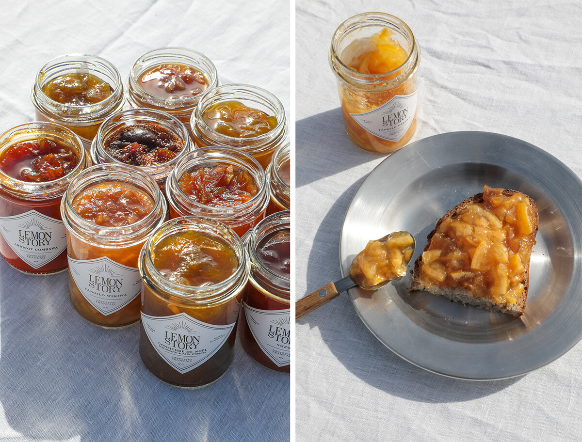 果肉と皮がたっぷり詰まったジャムは約10種(各9.50ユーロ)。パティスリー作りにも役立ちそう。いまの季節はカラマンシーとパンデピスのノエルのジャムも。