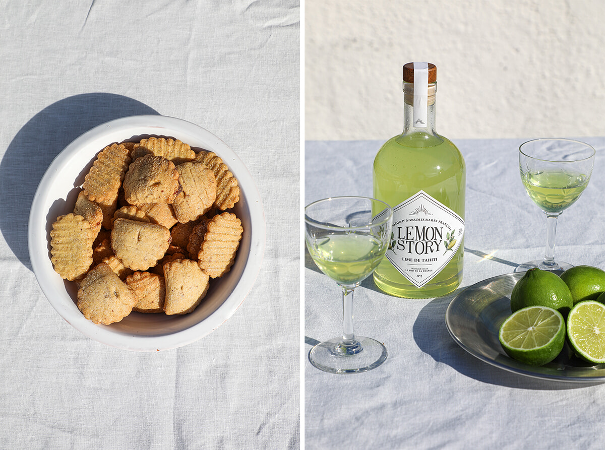左: 柚子のジャムを詰めたビスキュイ(1袋12ユーロ)。カラマンシーのジャムのビスキュイもある。 右: タヒチのライムや柚子、カラマンシーなどリモンチェロの種類は豊富。10clのミニサイズもあるのがうれしい。