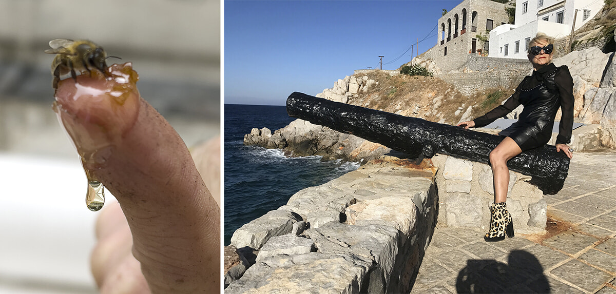左:『Bee, honey and finger』Paris 2022 ©️Juergen Teller, All rights Reserved 右:『Suzanne in Hydra』Greece 2017。パリでユルゲンの作品展を2014年、2021年に開催したシュザンヌ・タラシエーヴ(2022年没)。若いアーティストを3区の画廊で支援し続けたギャラリストだ。©️Juergen Teller, All rights Reserved