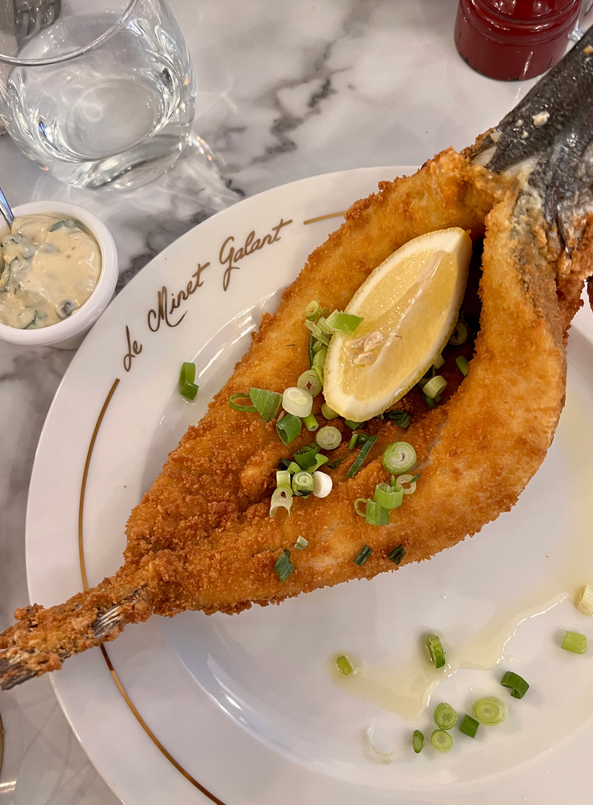 コルベール風スズキのグリビッシュ・ソース、インゲン添え(31ユーロ)。中骨を外した魚にパン粉をつけてフライに。photo:Mariko Omura