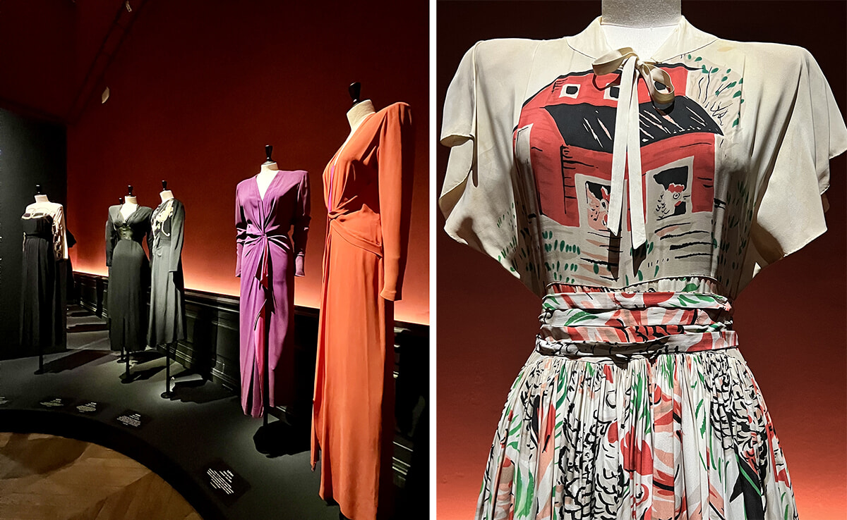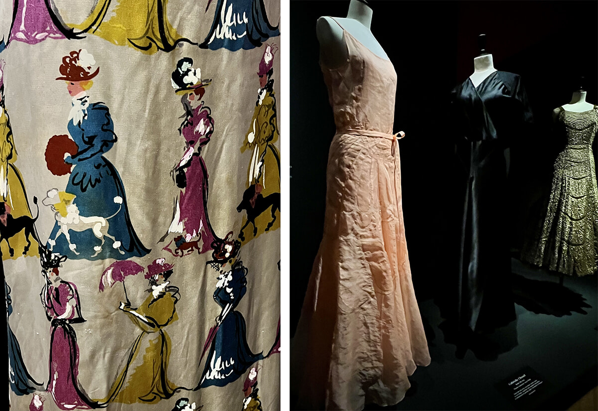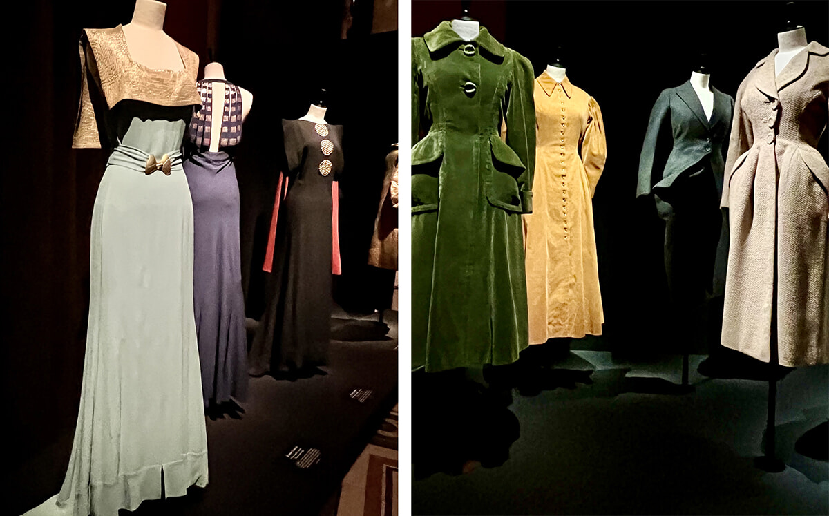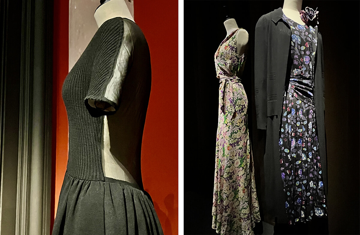左: スキャパレリ。会場ではとても近い距離で展示品を鑑賞できる。 右: シャネル。研ぎ澄まされたエレガンスが感じられる収集だ。photos:Mariko Omura