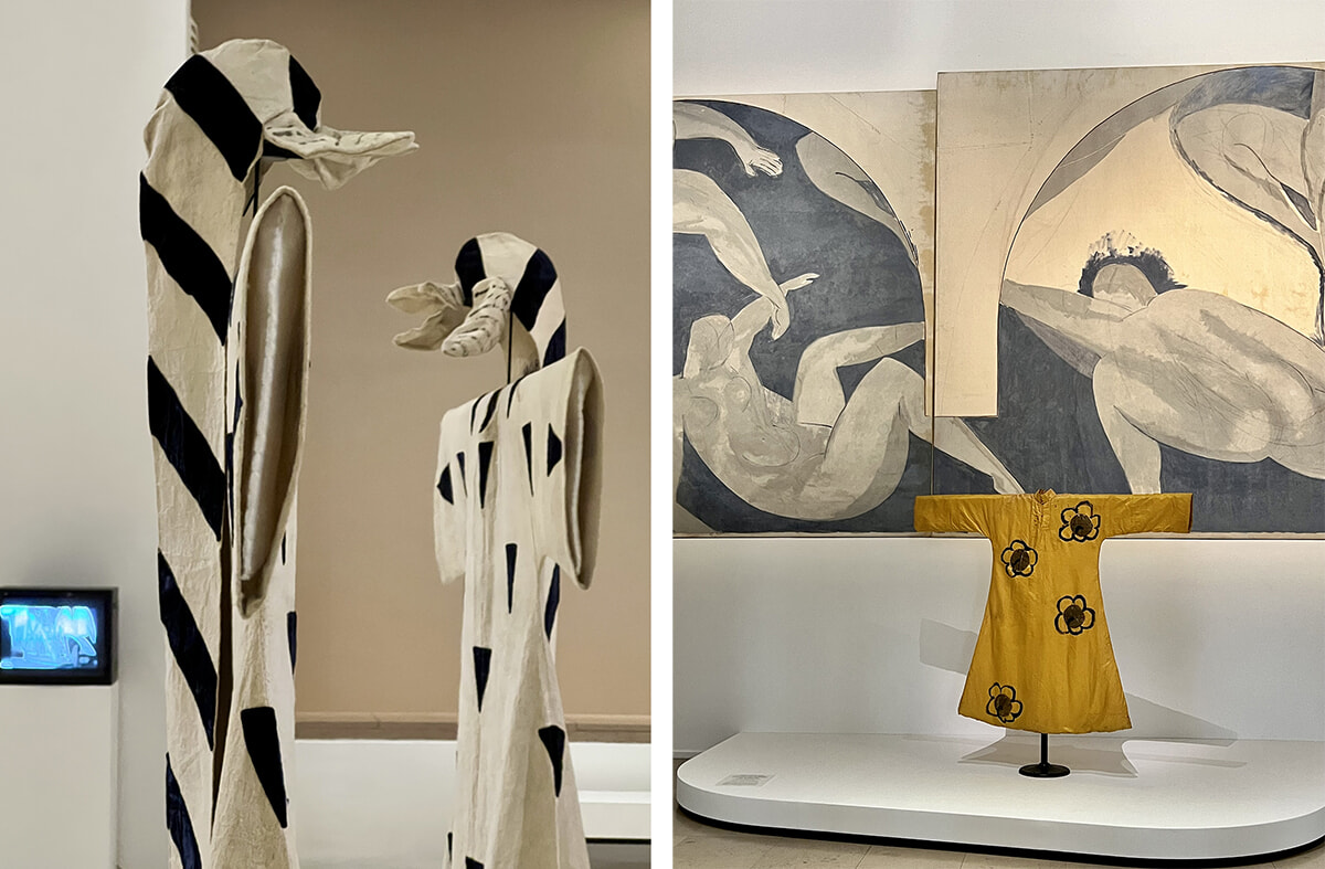 左: 横から見ると鳥のコスチュームであることがよくわかる。 右: 『未完成のダンス』(1931年)の前の展示は、王のコスチューム。photos:Mariko Omura