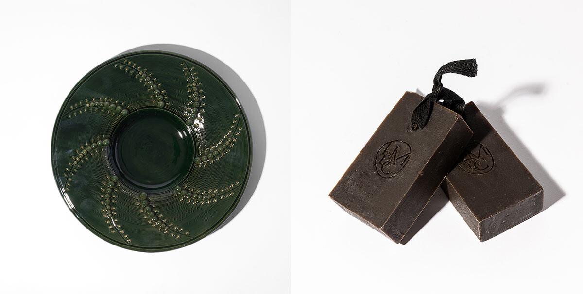 左: 麦をモチーフにしたグリーンのプレート。メゾン・ドゥ・コメルス・コレクションより。265ユーロ 右: メゾン・ドゥ・コメルスのロゴ入りのオリジナル、泥炭石鹸。1個12ユーロ
