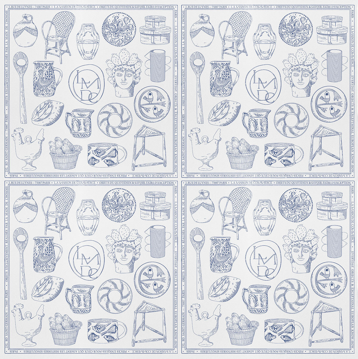 テーブルの上の陶器はメゾン・ドゥ・コメルスのオリジナルだ。