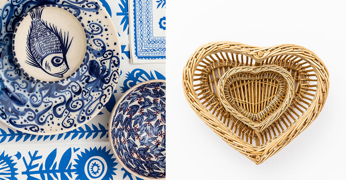 左: ギリシャから届いた食器類。ボールは37ユーロ〜。 右: ハートのフォルムがチャーミングなパニエ。115ユーロ〜