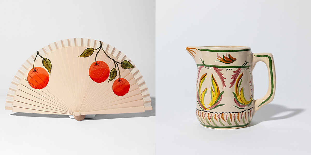 左: オレンジが明るく輝く扇はカタルーニャ地方で手作りされている。115ユーロ 右: メゾン・ドゥ・コメルス・コレクションから小型ピッチャー。42ユーロ