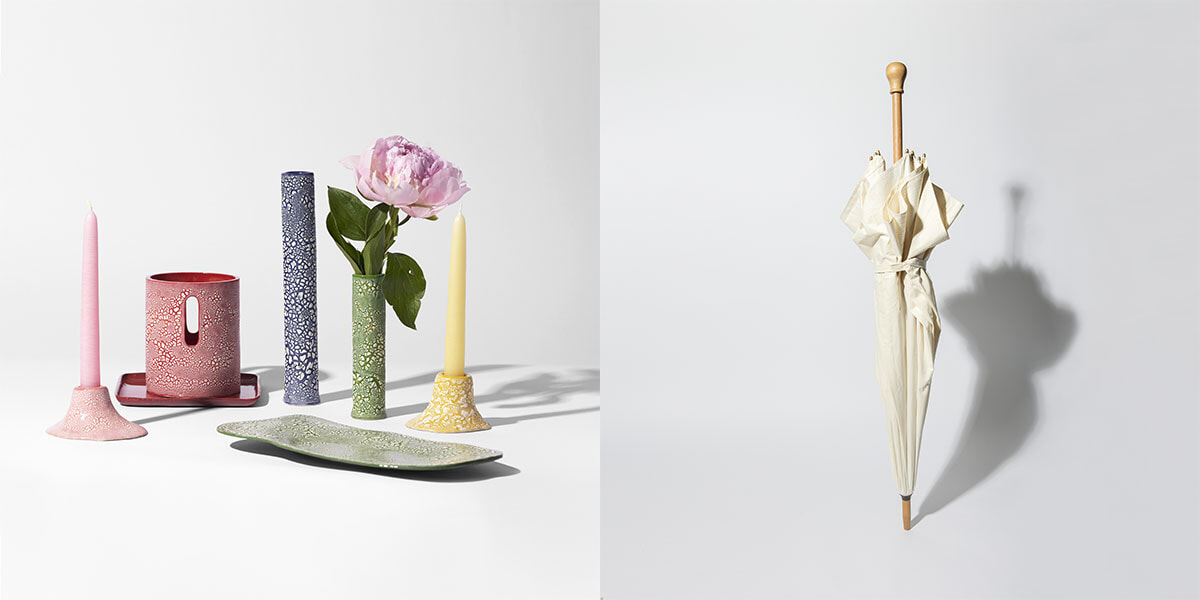 左: Sophie Spinosiによるガリューシャの一輪挿しやキャンドルスタンドは新作。 右: 木とコットンキャンバスの大きな羊飼い用傘。295ユーロ