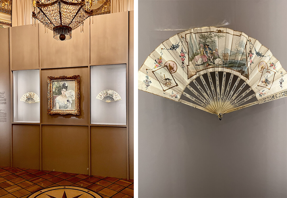 左:最初の展示は、ベルト・モリゾの『Au bal(舞踏会にて)』から。彼女が所有した18世紀の2本の扇とともに。 右:『Au bal』でモデルが手にしているのが、展示右側のこの扇だ。photos:Mariko Omura
