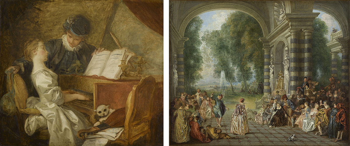 左: ジャン=オノレ・フラゴナール『La leçon de musique』(1769年)© RMN-Grand Palais (musée du Louvre) / Franck Raux 右: アントワーヌ・ワトー『Les plaisirs du bal』(1715〜17年頃)