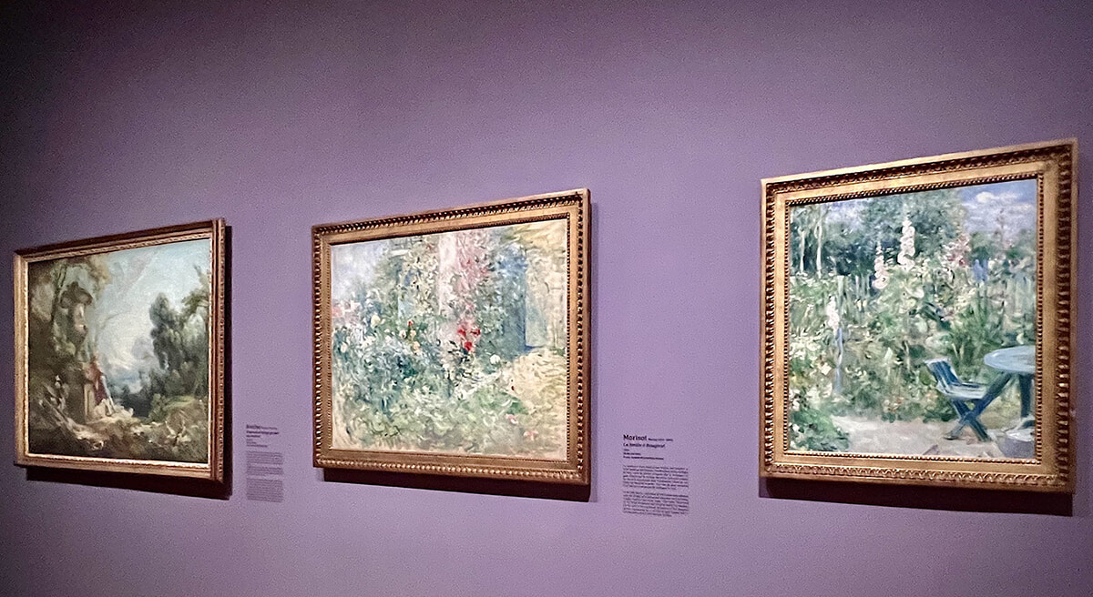 左はフランソワ・ブーシェが描いた牧歌的光景、右2点はベルト・モリゾが描いたブージヴァルの庭。photo:Mariko Omura