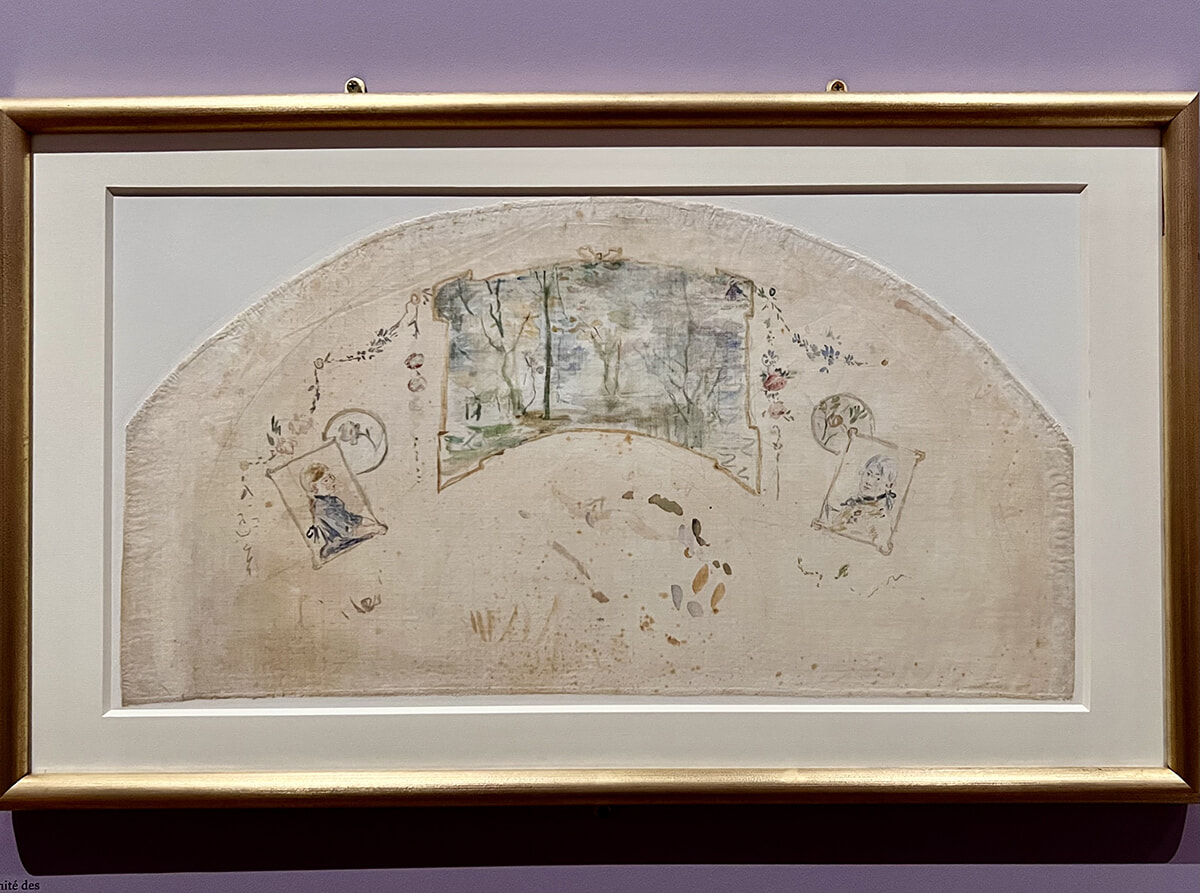 展覧会は、彼女の作品として有名な作品のひとつで美術館所蔵の『Au Bal(舞踏会にて)』(1875年)で幕を開ける。描かれているのは舞踏会のドレスを纏い、扇を手にしたパリジェンヌ。その作品の左右には彼女が所有していた18世紀のシルクの扇を展示している。そのひとつは『バル』でモデルが手にしている扇だ。
