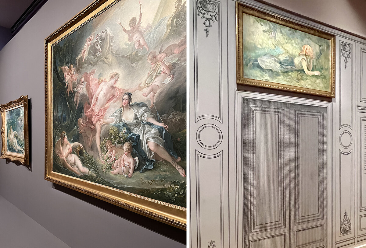 左: フワンソワ・ブーシェの『Apolon révélant sa divinité à la bergère Issé』(1750年)と、その左にこの作品の左下の一部をモリゾが1892年に描いた作作品を展示。 右: マルモッタン美術館が所蔵する『Bergère couchée』(1891年)。室内装飾用のため63×114cmの横長サイズで描かれている。会場では18世紀風内装をイラストで作り、そこに展示している。photos:Mariko Omura