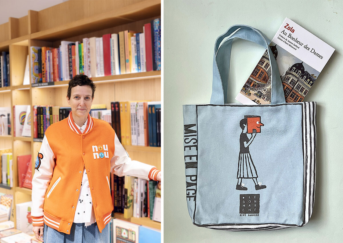 左: サラ・アンデルマン。ジャン・ジュリアンのブランドNouNouを着て。 右: サラを描いた展覧会のメインビジュアルのトートバッグ。期間中のショッピングバッグもこのモチーフだ。photo: (右)Mariko Omura