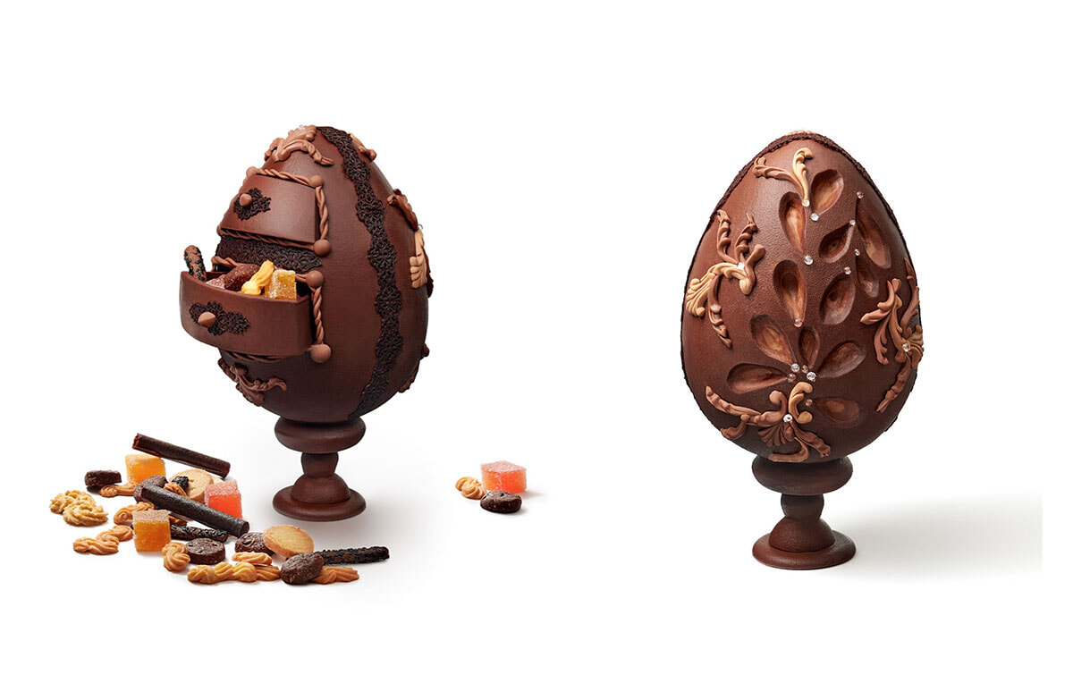 50個限定!と希少価値が高いのは、ヴァンドーム広場のパーク ハイアット パリのイースターチョコレートだ。ホテルのシェフパティシエのナラエ・キムは昨年のノエルには宝石をはめ込んだブローチのようなパティスリー、今年のエピファニーにはダイヤモンドで周囲が飾られたヴァンドーム広場を模した8角形のガレットをクリエイト。そしてイースターにはビジュー・エッグである。手前の引き出しには、ミニクッキーやパート・ド・フリュイなどが隠されていて、まるで宝石箱! 背面には繊細な仕事が施され、ひとつの制作に10日を要するそうだ。宝石のようなエッグチョコレートは食べられるアート作品!?