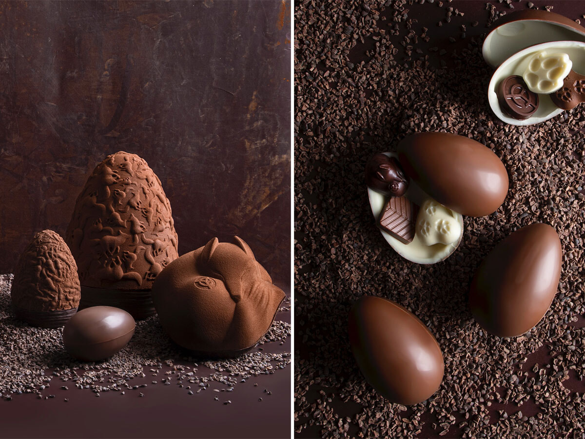 3月15日から販売が始まったイースターコレクション。左: 後方のキツネレリーフの卵のXLは69ユーロ(約880グラム)、右のミルクチョコレートのキツネは15ユーロ。 右: サプライズ・エッグ(10.50ユーロ)。コレクションはヤン・クヴルールの全ブティックにて販売だが、サプライズ・エッグのホワイトチョコレート版はギャルリー・ラファイエット・ル・グルメでの限定だ。