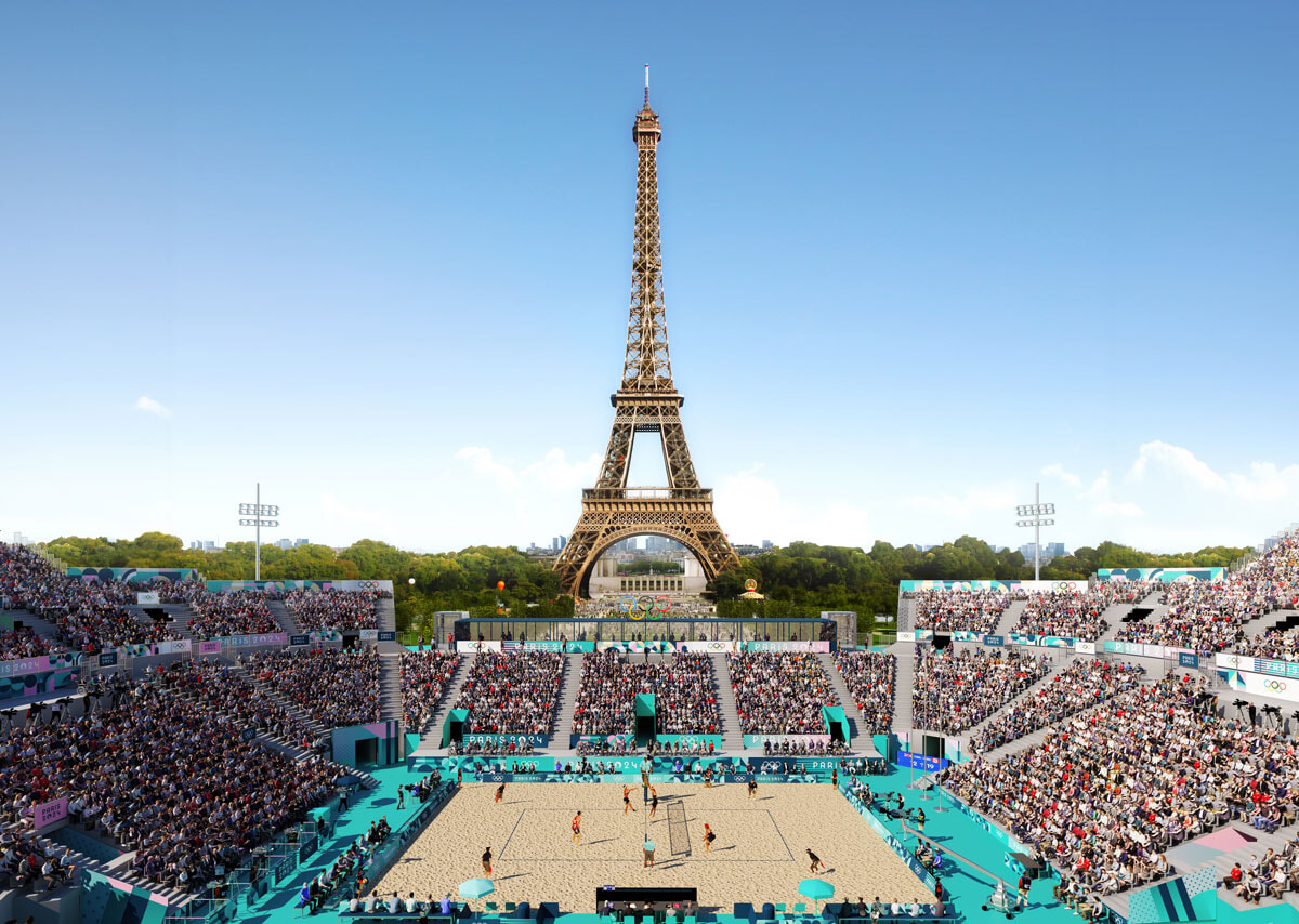 エッフェル塔脇の公園は、パリ祭の花火やライブが行われる祝祭の場。エッフェル塔とアリーナに挟まれたスペースがオープンエアスタジアムに。ビーチバレーボール会場でもあり、夏季オリンピックらしい風情を盛り上げる。