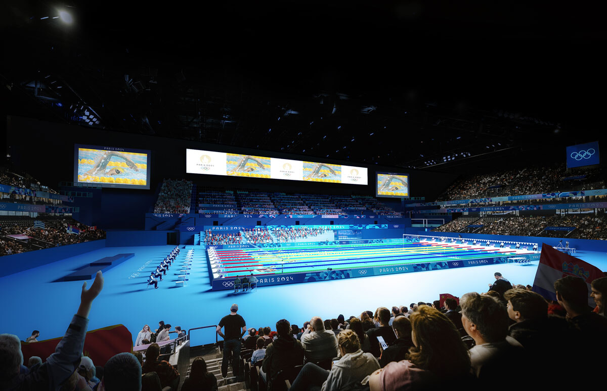 五輪のために建設される数少ない新設施設のひとつは4月4日に完成したばかり。スタッド・ドゥ・フランス(2)と道路を挟んで隣接し、行き来できる大歩道橋も造られた。今大会から男子アスリートが加わるアーティスティックスイミングに注目。