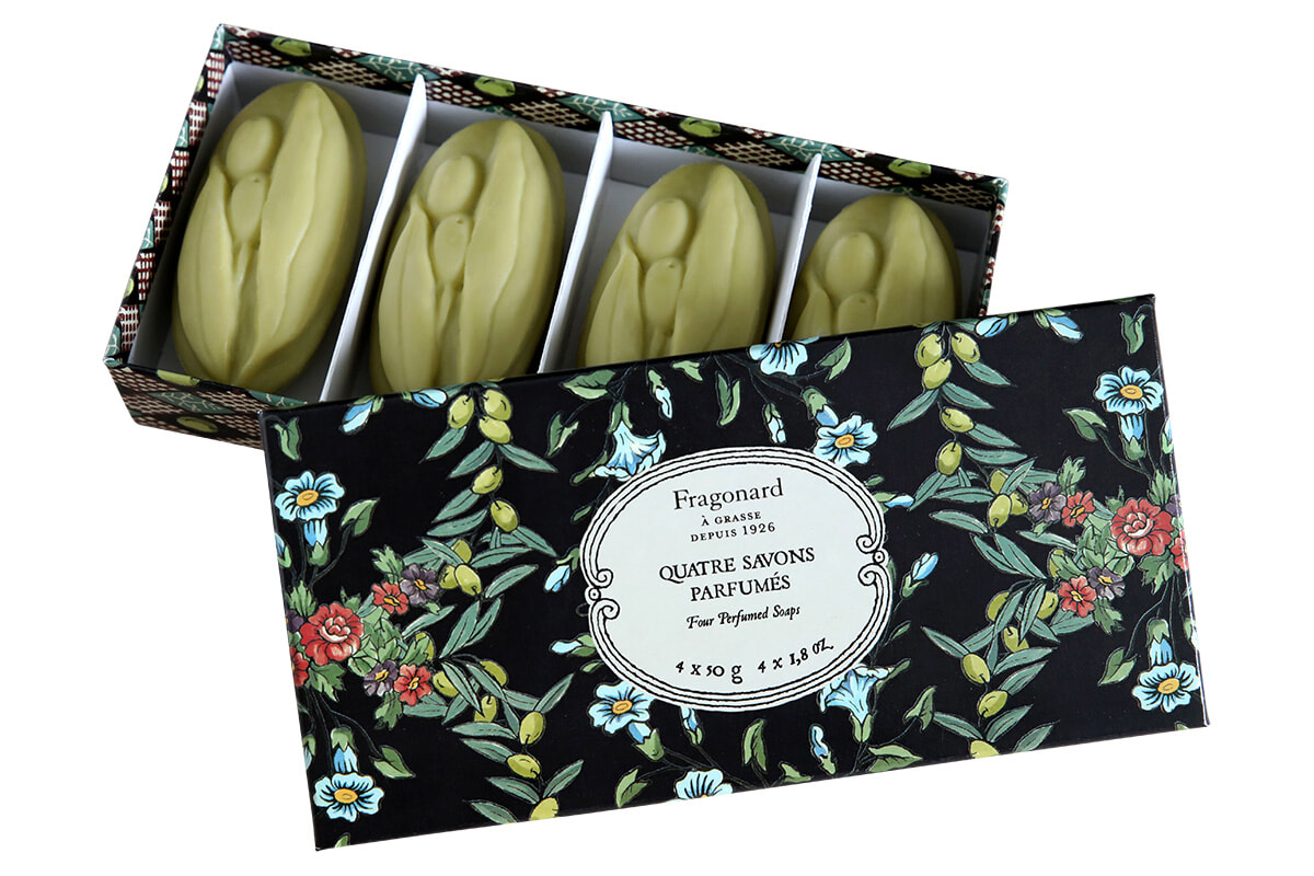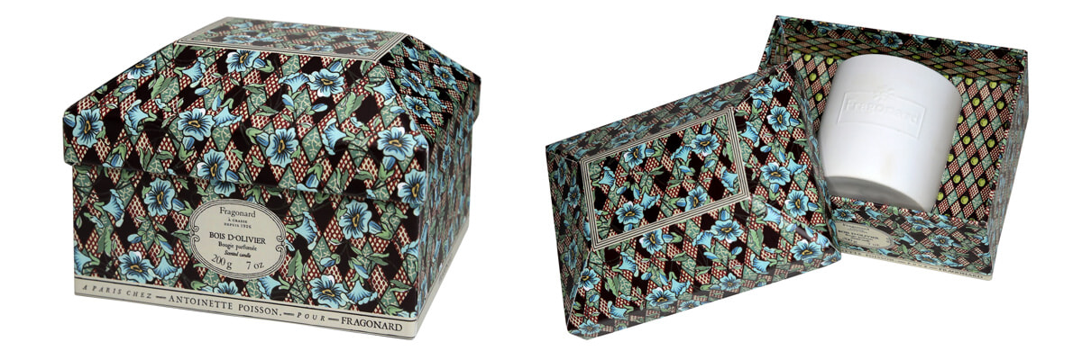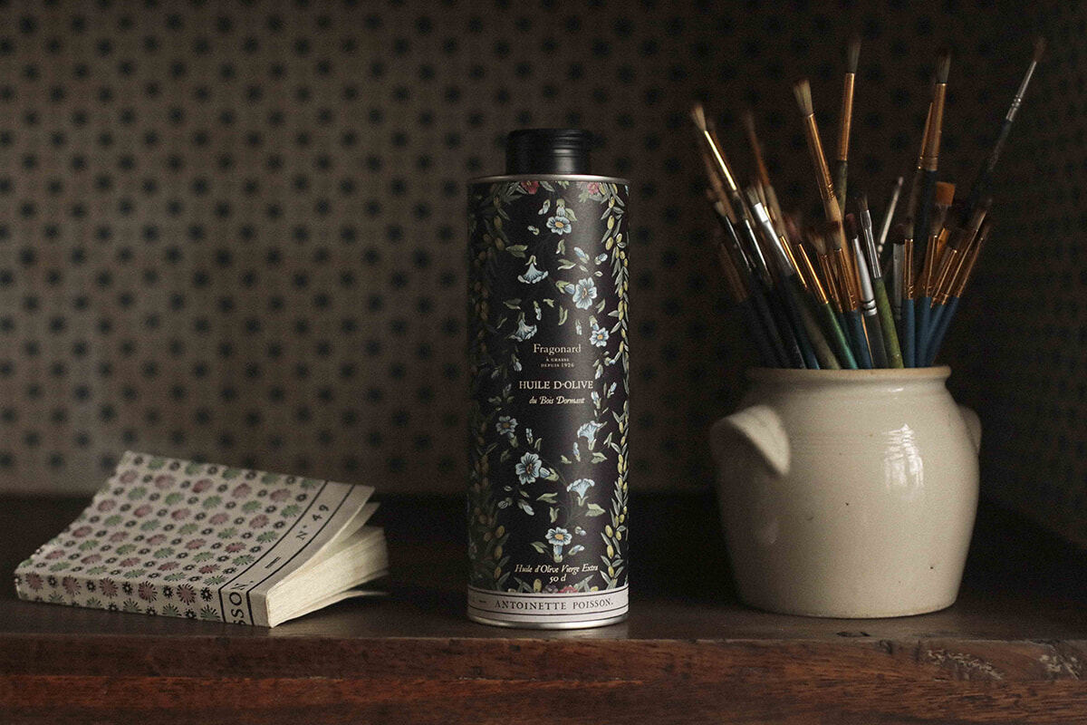 フラゴナールはグラースのオリーブ畑「Bois dormant(眠れる森)」の恵みであるオリーブオイルを4年前から限定販売している。その2024年度の容器のデザインを含む4つの品で、フラゴナールとアントワネット・ポワソンがコラボレーションを行った。フラゴナールがグラースに持つ「プロヴァンス地方のコスチュームとジュエリーの美術館」の所蔵品にインスピレーションを得たアントワネット・ポワソンは、まずオリーブオイルの容器を飾るモチーフをデザインした。さらに、そのモチーフはラベンダーの香りのオリーブオイル石鹸4個セットのボックスの蓋にも。このボックスの本体はオリーブの実をメインにした幾何学モチーフが描かれているので、蓋を閉めて横から見たときに2種のモチーフがハーモニーを織りなしているのがとても素敵。