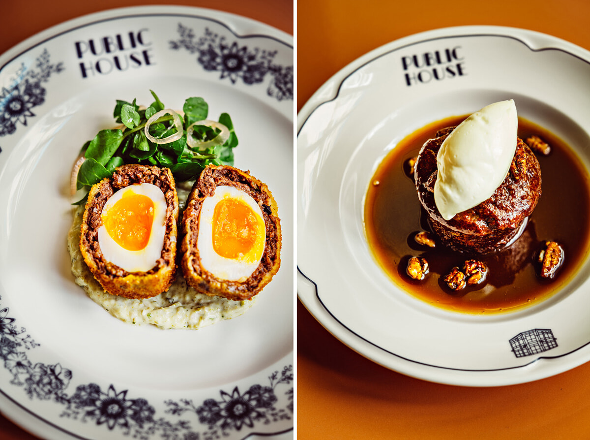 左: スコッチエッグ。右: スティッキー・トフィー・プディング。Photos: Benoît Lénéro