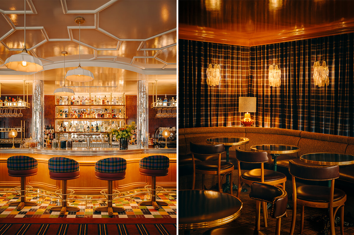 室内建築を任されたのはパリ市内でレストランやホテルを手掛けている人気者のローラ・ゴンザレス。フランスのブラッスリーのコードと英国のパブのコードを上手にミックスして、フレンチエレガンスとパブのカジュアルさが共存する食空間を作り上げた。1階、自然光にあふれる広々としたレストランスペースには居心地良く和めるボックス席も用意されている。10メートル長さのカウンターも圧巻だ。上のフロアにはプライべート・クラブ的雰囲気のスペースも。いずれは地下にバーがオープンする。タータンチェックのカーテンが壁を覆う空間で、夜を楽しく過ごすことができそう。