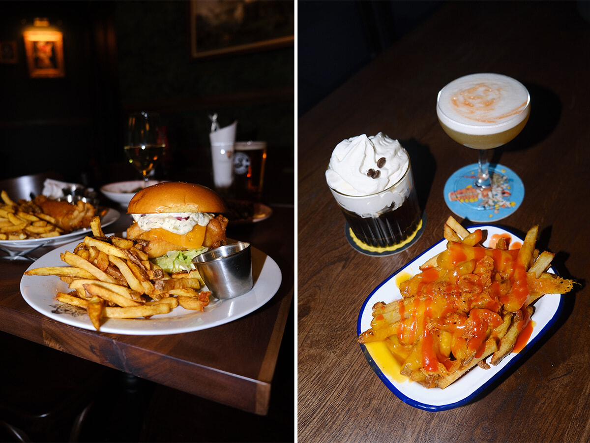 左: フィッシュバーガー&チップス(18.5ユーロ)。右: チーズのフライ(8ユーロ)をビールやカクテルのお供に。カフェベースのカクテルも。photos: Thomas Jaspers