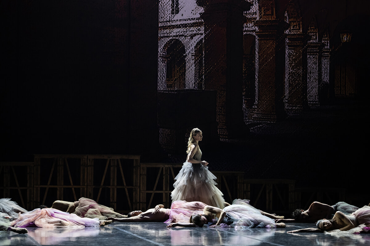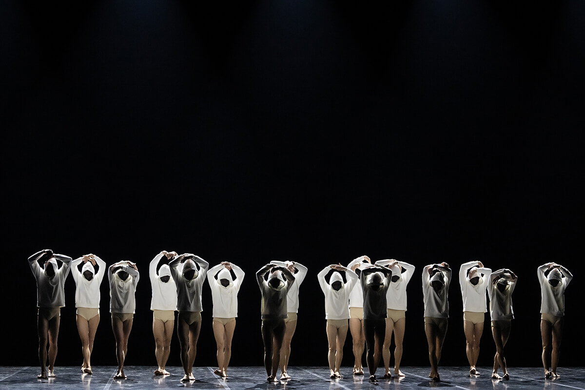 『Nuit blanche (白夜)』のコスチュームをつけて、後方中央のエレオノーラ・アバニャート、フリーデマン・フォーゲル、セバスチャン・ベルトーを囲むダンサーたち。Dior_Opera de Rome ©Julien Beanhamou