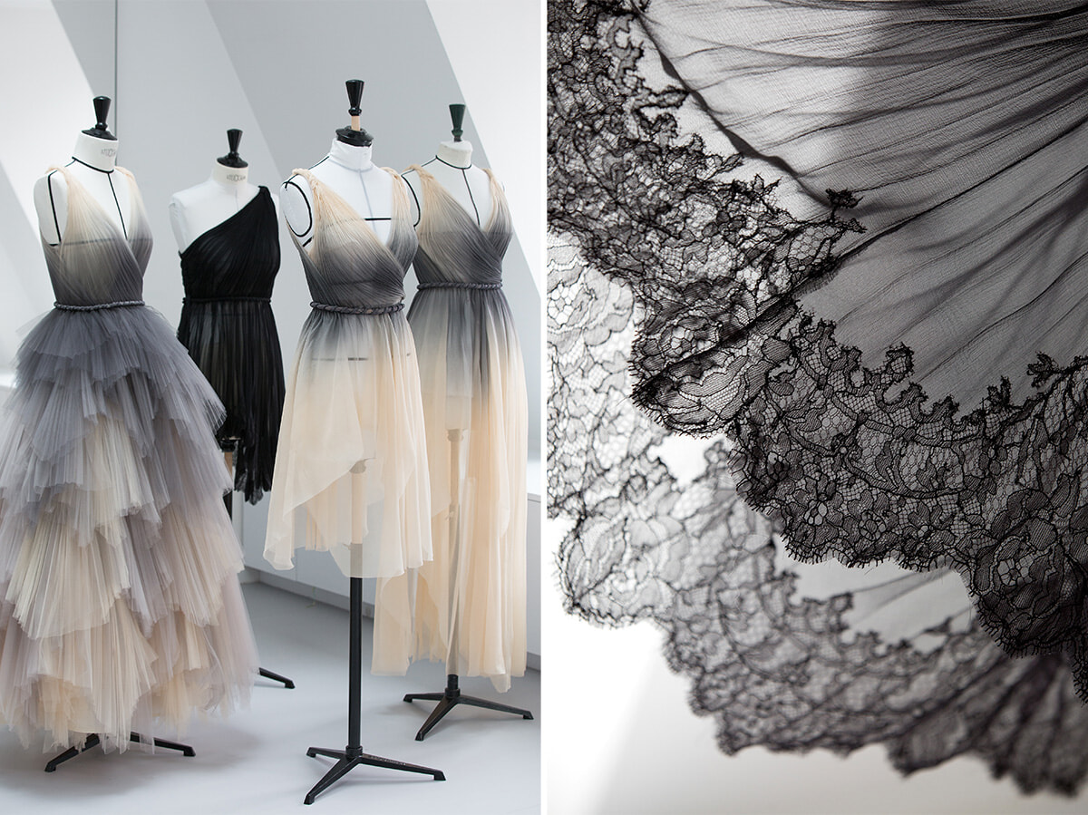 プリーツ、レース、シフォン……オートクチュールの素材とサヴォワールフェールを用いた繊細なステージ衣装がディオールのアトリエで製作された。
