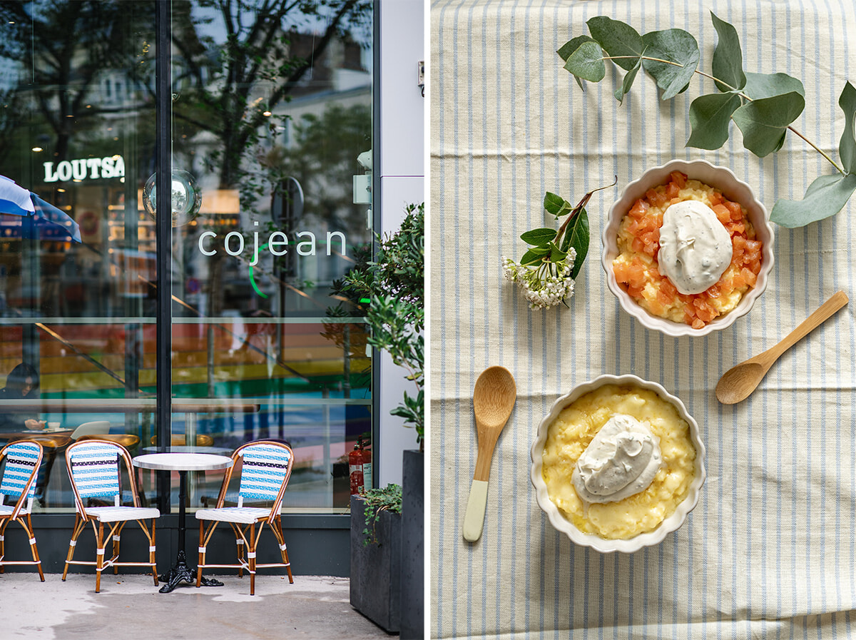 左: パリ市内、ラスパイユ大通りやギャラリー・ラファイエットの近くなどコジャンは多数ある。最新は16区のヴィクトル・ユーゴー大通り店だ。右: スクランブルエッグはコンテチーズAOP(写真下)かサーモンの2種あり。