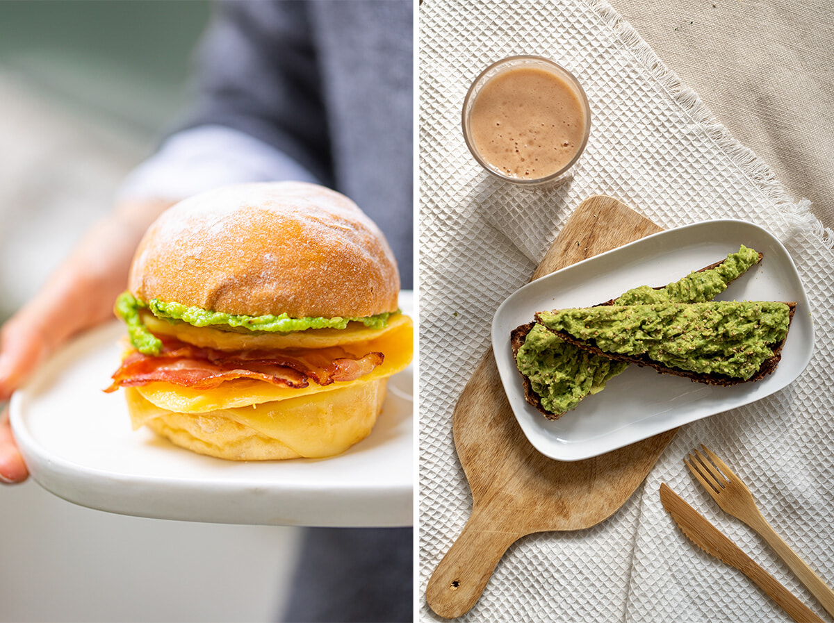 左: 英国風にエッグ・ブリオッシュ? これのみ11時30分まで。右: アボカドトースト。