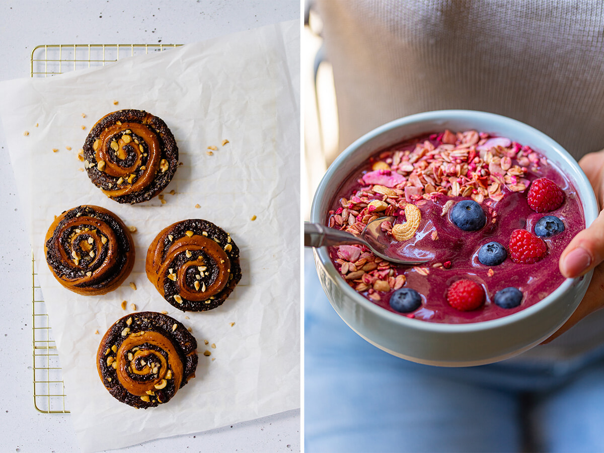 左: チョコレート&ヘーゼルナッツのバブカ。右: アサイーボウル。