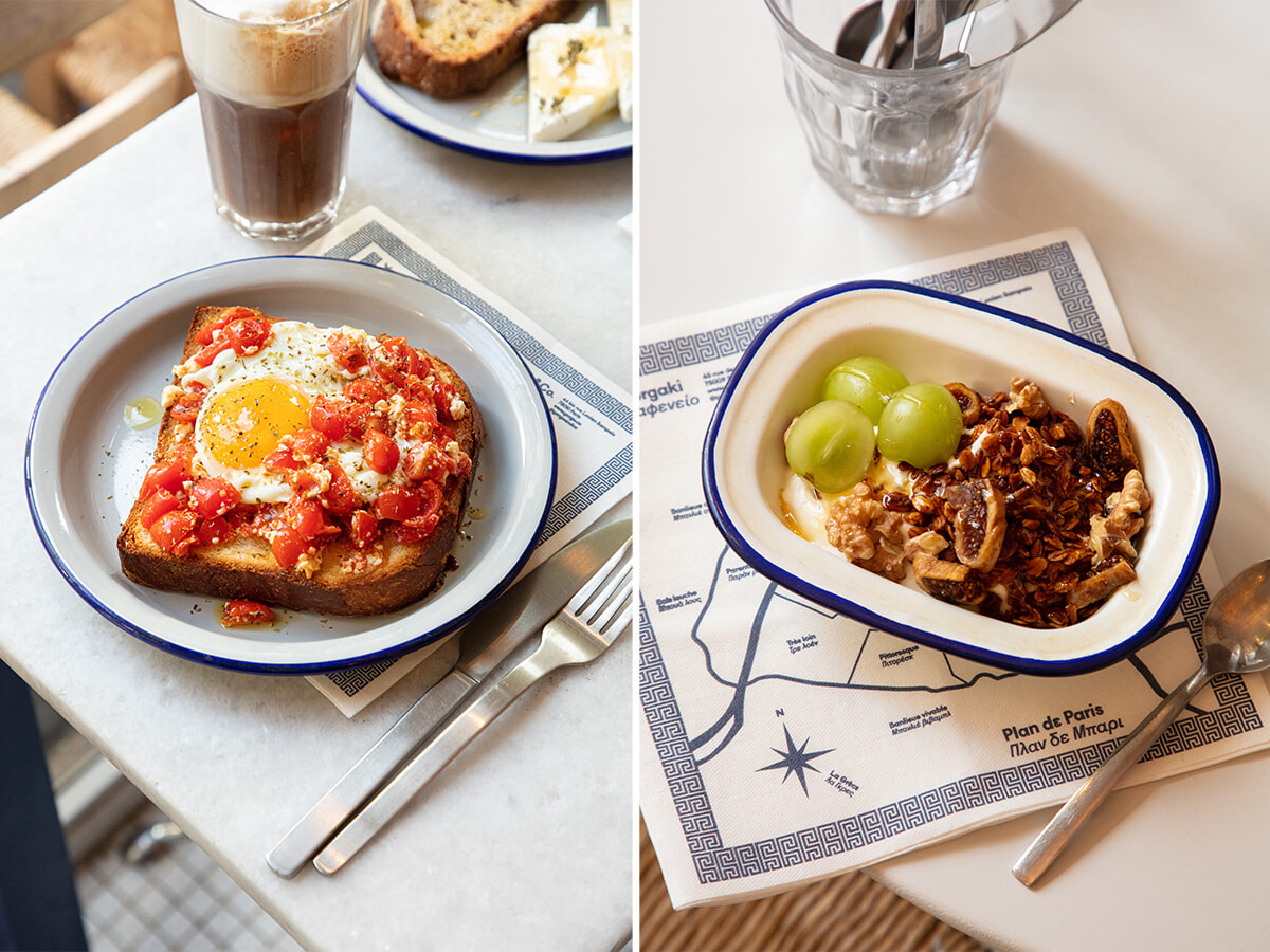 左: 卵とフェタチーズのトースト 14ユーロ。右: ヨーグルト。ハニーだけ、あるいはグラノラ、フルーツとともに。photos: Emmanuelle Lubaki ©Yorgo&co